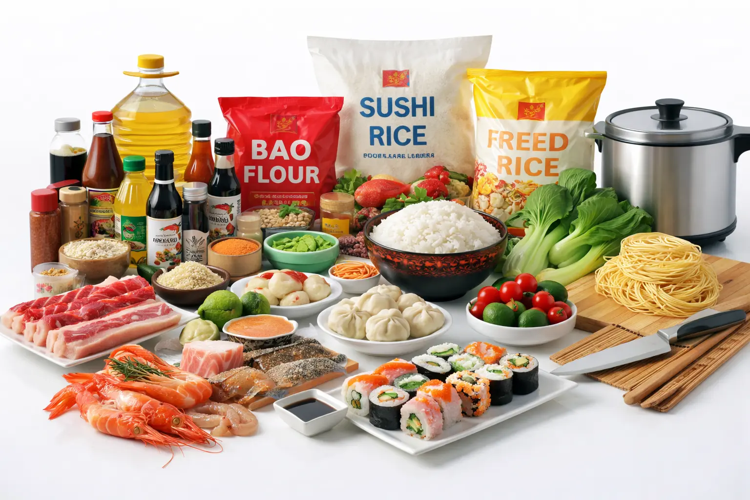 We offer a comprehensive selection of food and catering products, including seasonings, rice, oils, sushi ingredients, fresh and frozen meat, frozen seafood, dim sum and pastry items, fresh vegetables, as well as professional kitchen tools and equipment.